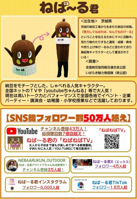 おしらせ 2026/02/16 3/7(土)ひたち×にっぽん交流フェスに参加! 「ひたち×にっぽん交流フェス」にねば〜る君とうめねばちゃんと納豆お兄さんが参加します! 日時:2026年3月7日(土) @10:00〜 A11:40〜 B14:00〜 場所:日立シビックセンター新都市広場 (〒317-0073 茨城県日立市幸町1丁目18) 他にも あさく侍 バクバクちゃん ミスターC。 そふとくり犬も参加しますよ〜!